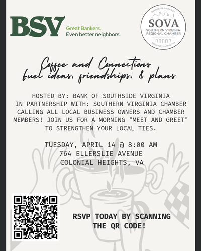 Hosted by: Bank of Southside Virginia In partnership with: Southern Virginia Chamber Calling all local business owners and Chamber members! Join us for a morning "meet and greet" to strengthen your local ties.