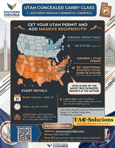 Ready to expand your carry options? TAC Solutions is offering an official Utah Concealed Carry Permit Course on Tuesday, April 21st! The Utah permit is widely recognized across multiple states — making it a smart addition for responsible gun owners looking to increase their lawful carry coverage.
